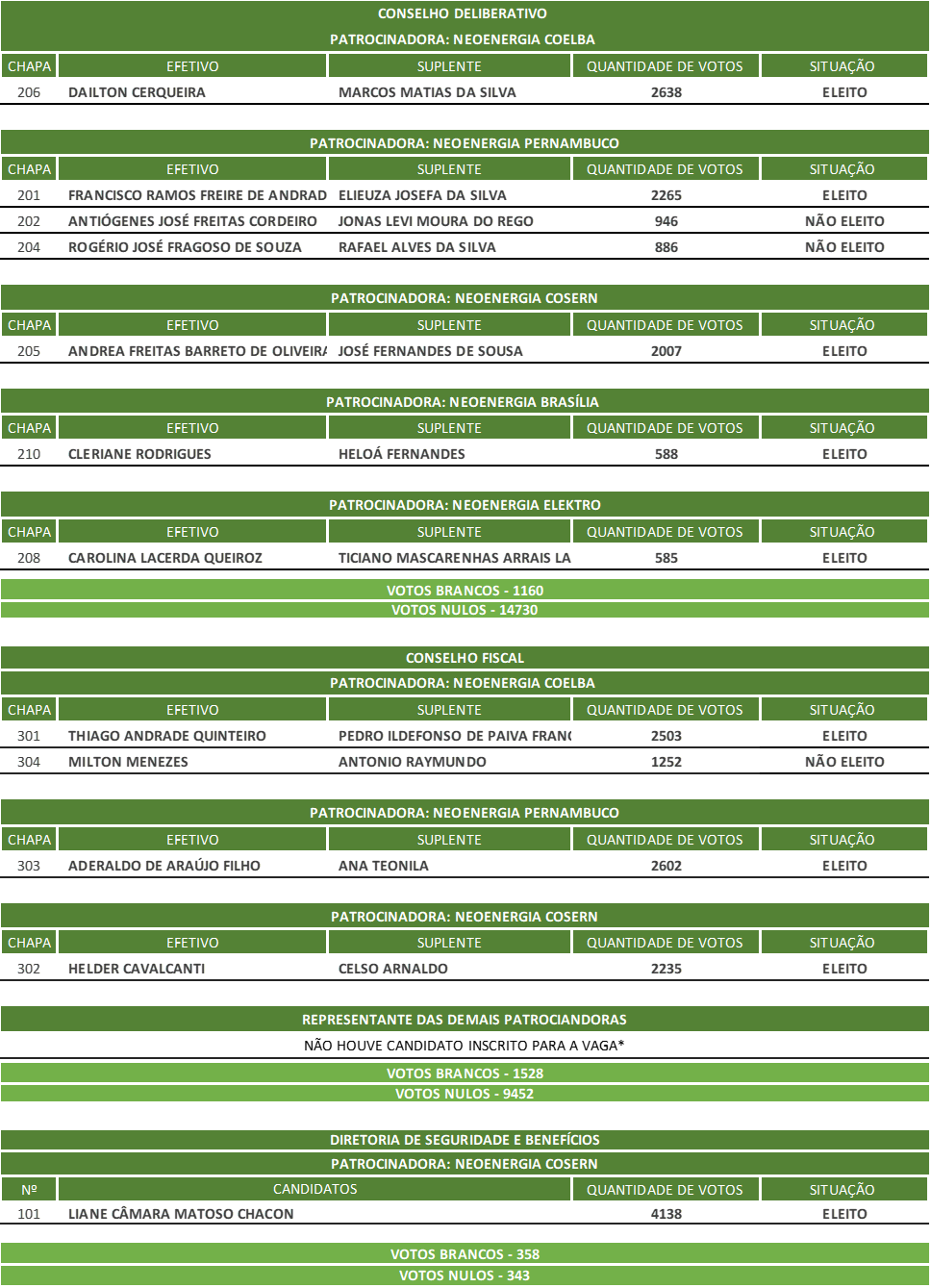 * Conforme indicado no item 3 do Edital das Eleições Néos, em atenção ao critério de proporcionalidade previsto no art. 35, §§1º e 2°, da Lei Complementar 109/2001, no Estatuto da Néos e no Regimento Eleitoral, a composição do Conselho Fiscal deve guardar a seguinte proporção: (vaga 1) 01 (uma) chapa para participantes e assistidos vinculados à Companhia Energética do Rio Grande do Norte – COSERN; (vaga 2) 01 (uma) chapa para participantes e assistidos vinculados à Companhia de Eletricidade do Estado da Bahia – COELBA; (vaga 3) 01 (uma) chapa para participantes e assistidos vinculados à Companhia Energética de Pernambuco – CELPE; e (vaga 4) 01 (uma) vaga para participantes e assistidos vinculados às patrocinadoras listadas no ANEXO IV do Edital das Eleições Néos. Entretanto, houve inscrição de candidatos apenas para as vagas 1, 2 e 3, não tendo sido preenchida a vaga 4.