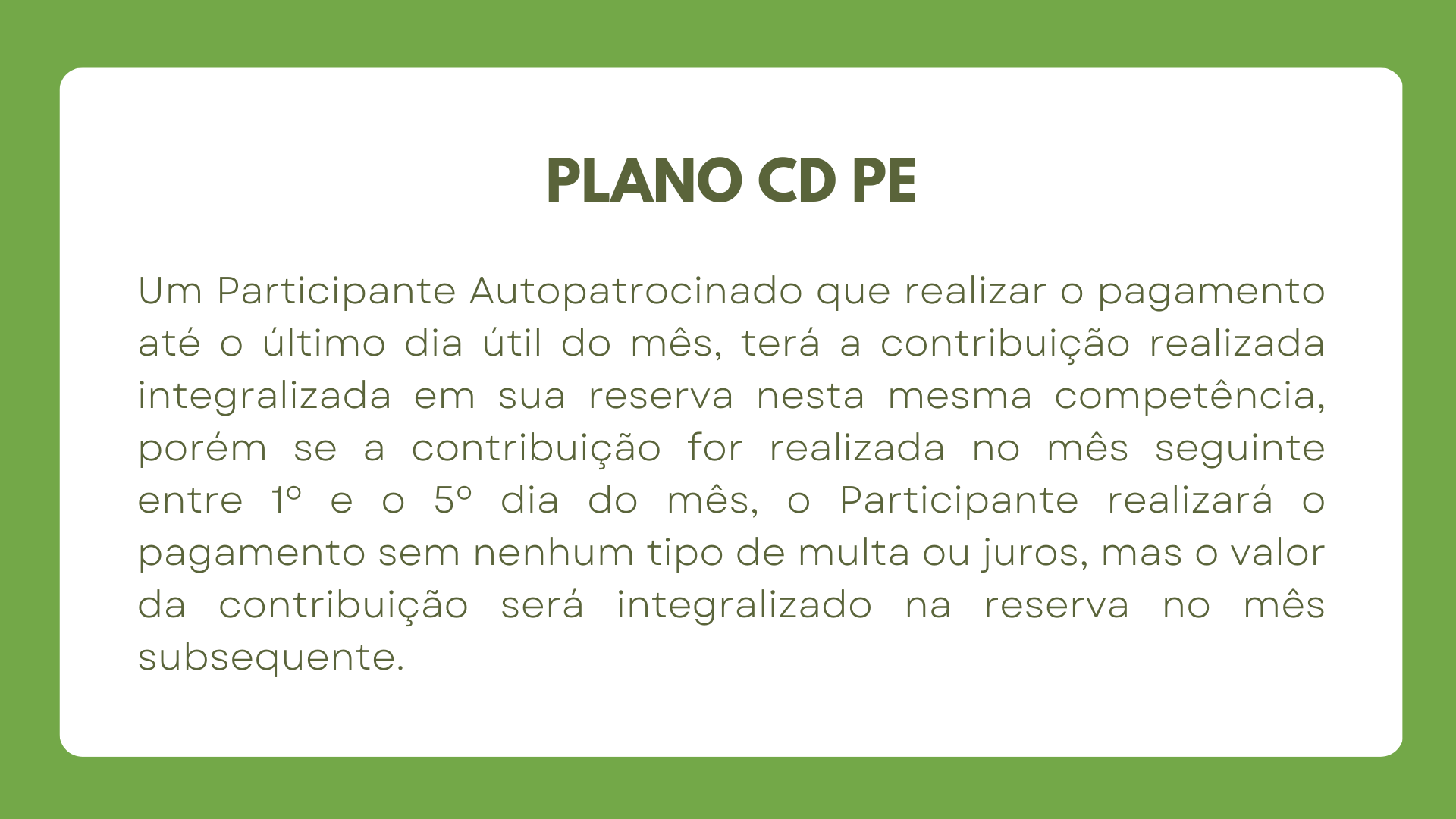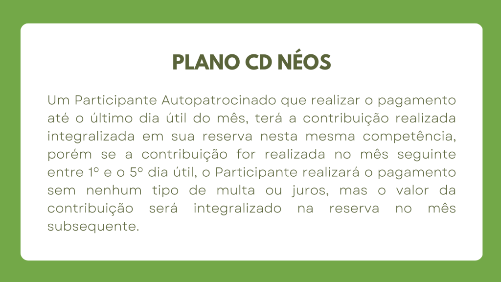 Em busca contínua pela otimização das nossas operações, informamos uma mudança na sistemática de pagamento dos boletos dos Autopatrocinados vinculados aos Planos CD PE e CD Néos. A partir de agora, os pagamentos realizados terão os valores integralizados na reserva no referido mês de pagamento. Essa mudança visa aprimorar a eficiência e transparência dos processos, seguindo as instruções da Resolução CNPC nº 43/2021.