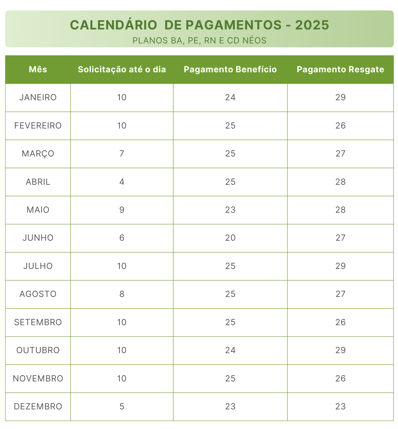 Os Assistidos da Néos já podem conferir, abaixo, as datas de pagamento dos Benefícios em 2025.
