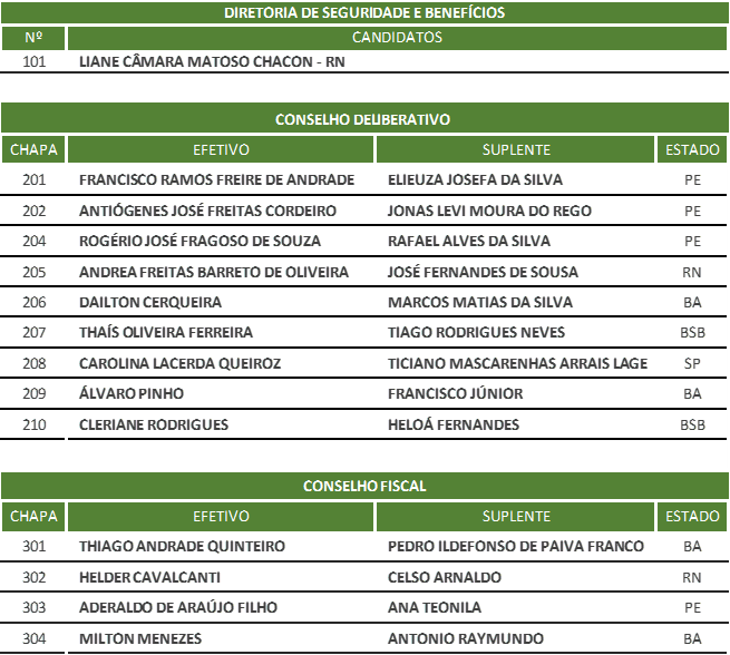 Conforme previsto no Edital e Cronograma das Eleições Néos, segue a lista com os candidatos e chapas cujas inscrições foram homologadas pela Comissão Eleitoral para participar do pleito referente aos cargos de Diretor(a) de Seguridade e Benefícios e membro dos Conselhos Deliberativo e Fiscal. A disposição das chapas e dos candidatos obedecem à seguinte ordem das inscrições.