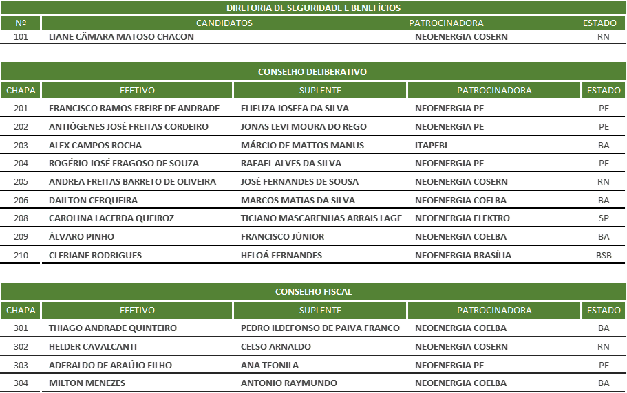 Conforme previsto no Cronograma das Eleições Néos, o processo eleitoral encontra-se em período de campanha. Abaixo, segue a lista com os candidatos e chapas que irão participar do pleito referente aos cargos de Diretor(a) de Seguridade e Benefícios e membro dos Conselhos Deliberativo e Fiscal.