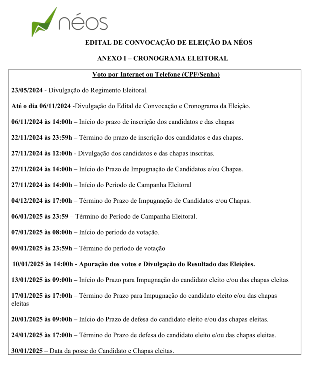 Confira aqui o cronograma completo das Eleições NÉOS 2024.
