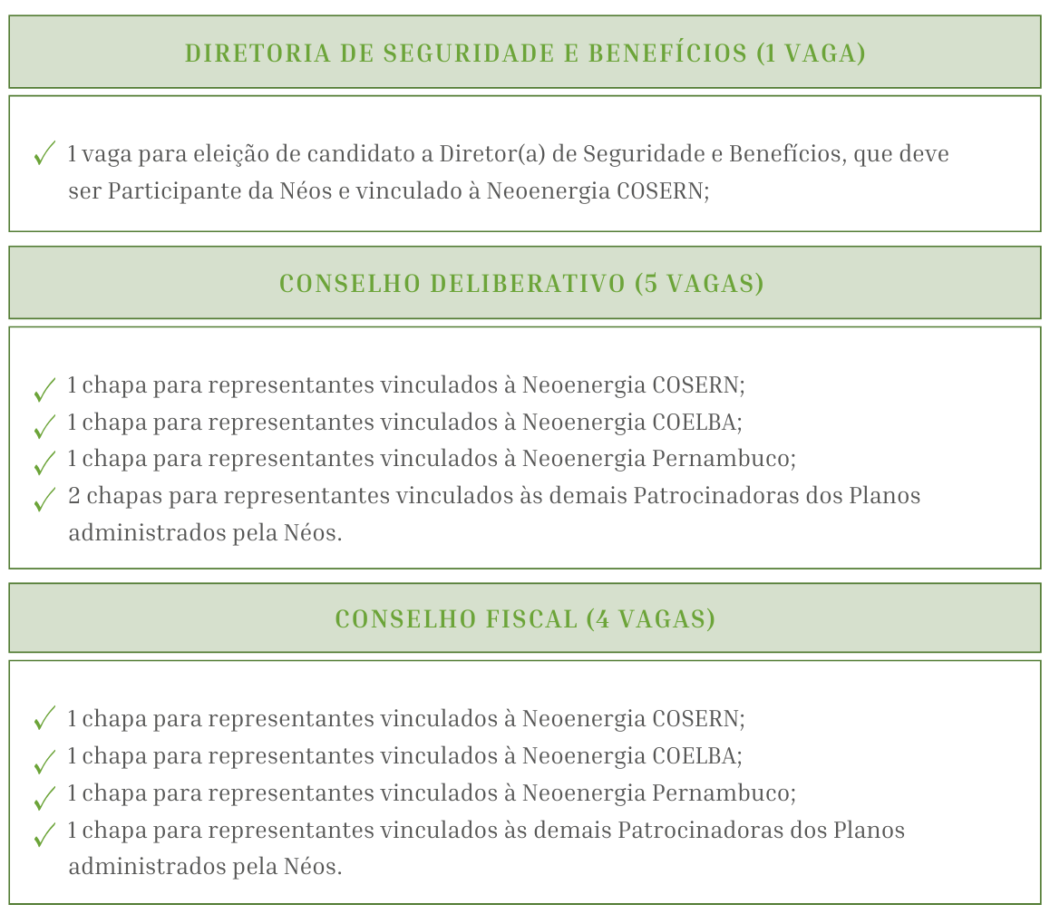 Entenda como se dará a apuração dos votos das Eleições da Néos 2024 para identificação dos candidatos eleitos para as vagas disponíveis. Essas eleições irão eleger os representantes de Participantes e Assistidos, de acordo a composição abaixo: