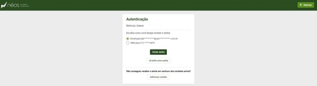 Para votar pela internet, basta acessar o site da Eleição (https://www.eleicoesneos.com.br/) e clicar em “Votar” e digitar CPF e senha exclusiva, enviada pela Néos, via Correios, para os endereços cadastrados na Entidade. Lembrando que a senha é individual e que o sistema permitirá o registro do voto, apenas uma vez. Caso não tenha recebido a sua senha pelos correios poderá recuperá-la através do site da eleição, seguindo as instruções abaixo, ou clique aqui para assistir o vídeo explicativo.