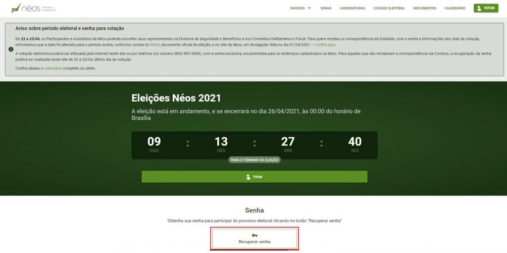Para aqueles que não receberam a correspondência via Correios, a recuperação da senha poderá ser realizada no site da Eleição de 20 a 25/04, último dia de votação.