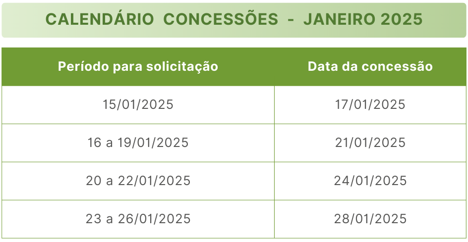 A Néos informa que as concessões de empréstimos já estão disponíveis. O calendário para realizar as solicitações poderá ser consultado abaixo: