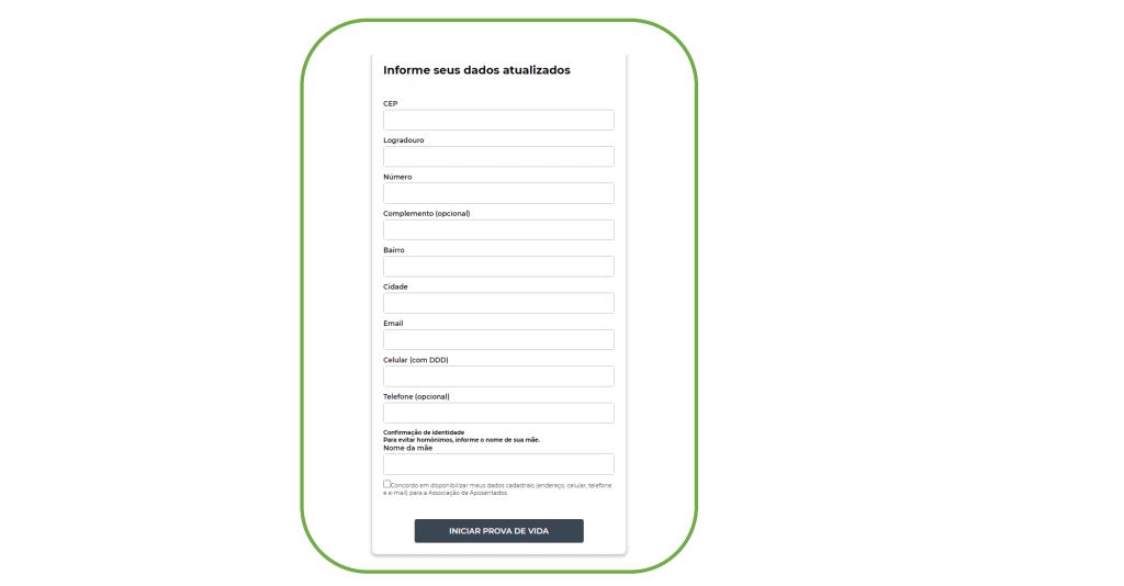 3. Atualize os dados cadastrais e salve. Nesse momento será enviado um SMS com o link para realização da prova de vida. Abra o link no celular.
