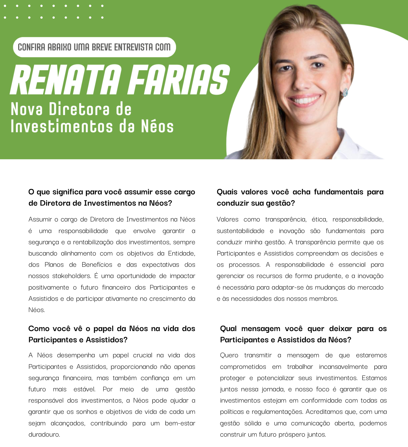 Renata chegará à Diretoria de Investimentos em um momento estratégico para a Néos, reforçando a importância de uma gestão sólida e responsável. Sua experiência será fundamental para garantir o crescimento dos investimentos da Entidade, alinhado aos interesses dos Participantes e Assistidos.