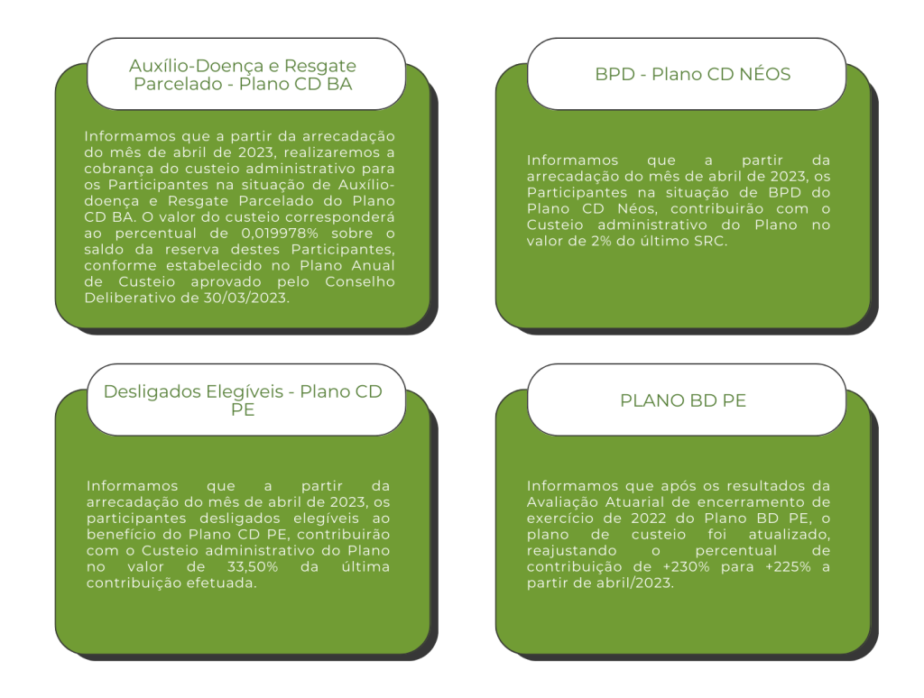 A Néos informa que o plano de custeio administrativo foi reavaliado para o exercício 2023. Confira, abaixo, as informações atualizadas referentes aos Planos CD BA, CD Néos, CD PE e BD PE: