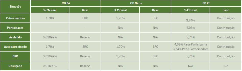 Com base na aprovação, por unanimidade e sem ressalvas, do Conselho Deliberativo da Néos em sua 70ª reunião ordinária, realizada em 19 de dezembro de 2024, informamos a redução do Custeio Administrativo dos Planos CD BA, CD Néos e BD PE. Os novos valores passam a vigorar a partir da referida deliberação, conforme detalhado abaixo: